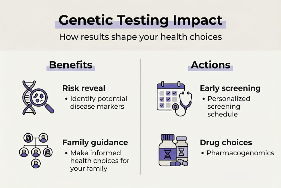Genetic testing reveals inherited risks and drug reaction patterns but does not guarantee you will develop any specific condition. Results guide screening schedules, preventive options, and medical decisions rather than serving as a definitive forecast.